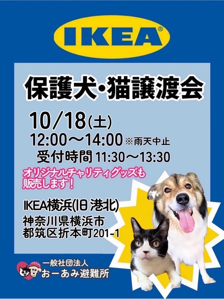 | イベント内容 | ☆★☆★☆★☆★☆★☆★☆★☆★☆★☆★☆★☆★☆ ~10月18日(土)IKEA横浜にて譲渡会開催!~ ◎場所・・「IKEA横浜」(旧IKEA港北) 神奈川県横浜市都筑区折本町201-1 (会場に利用可能な駐車場がございます) ※無料シャトルバス JRおよび横浜市営地下鉄 新横浜駅とIKEA横浜間(所要時間約20分) ◎日程・・10月18日(土)(雨天中止) ※中止の判断は当日9:00に判断し、IKEA横浜ホームページ、Facebookにてお知らせされます。 ◎時間・・ 12:00~14:00 (整理券配布時間11:30~13:30) ※お見合い時間枠は1回につき20分となっております。 *参加の際は、アルコール消毒のご協力をお願いいたします。 *混雑状況により、入場制限をさせていただく場合がございます。 ※参加予定の犬猫は体調により参加できない場合があります。ご了承ください。 ☆★☆★☆★☆★☆★☆★☆★☆★☆★☆★☆★☆★☆ |