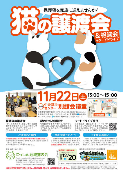 | イベント内容 | 11月22日(土)に「猫の譲渡会&相談会」を開催いたします。 保護猫を迎えたい方はもちろん、猫に関する相談会も同時開催しています。 ご近所との猫トラブルなどでお悩みの方も、どうぞお気軽にお立ち寄りください。 地域貢献の一環として、フードドライブの受付もしております。 ご家庭や職場で余っている食品がありましたらぜひお持ちください! 小さな譲渡会ですが、猫さんも人間も良いご縁を紡げられるよう、のんびり続けています。 遊びにきてくださいね(*^^*) 【日時】11月22日(土)13:00〜15:00 【会場】中央福祉センター「別館会議室」 【入場無料・予約不要】 【主催】にっしん地域猫の会 【ホームページ】https://nissinchiikineko.main.jp ※会場は中央福祉センター本館内ではなく、その隣の奥まったところにある小さな建物「別館会議室」にて開催しております。お手数ですが、HPにて地図をご確認ください(中央福祉センターへのお問い合わせはご遠慮ください)。 ※会場前に駐車場がございますが、数が少ないため、満車時は本館の駐車場をご利用ください。図書館のむかいにある市役所の臨時駐車場もご利用いただけます。 ※室内換気のため冷暖房が効きにくい場合がございます。 ※ペット同伴のご入場はできません。 ※猫ちゃんの譲渡には条件がございます。詳細はホームページをご参照ください。 |