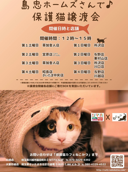 | イベント内容 | 保護猫カフェねこかつさん主催の保護猫譲渡会です☺︎ ねこかつさんや個人ボランティアさんの元で大切にお世話された、ちびっ子や大人猫ちゃんがたくさん参加します どなた様もご自由にご参加いただけます*♪ ❁譲渡には譲渡条件がございます ❁お申込みの際にはアンケートへのご記入がございます ❁当日に猫ちゃんを連れて帰ることはできません |