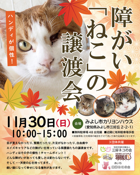 | イベント内容 | 第2回障がいねこの譲渡会となります。参加猫決定! 隻眼だったり、耳が聞こえなかったり、片足がなかったり、ハンディのある猫20匹が参加予定。 ハンディはその子の個性!チャームポイント!どんな障がいがあっても愛しさは変わらないです。 そして・・・天使の心を持ってます。 ▼参加猫紹介! http://miyoshineko.sblo.jp/article/191549515.html ☆★特別開催!障がいねこ20匹の譲渡会★☆ ●11月30日(日)10時~15時 ●みよし市カリヨンハウス(みよし市三好丘2-2-1) ※障がい猫お助け募金、フードバンクを行いますのでご協力お願いします。 【3団体共催】 NPO法人三好ネコの会 https://www.instagram.com/miyoshineko 猫暖心 https://www.instagram.com/nekodangonet あいち東郷ねこの会 https://www.instagram.com/togoneko2 ※各団体で譲渡条件が異なりますので会場でご確認ください。 —ご来場前に— ・猫を飼うには家族の協力が不可欠です。可能な限りご家族でご来場ください。 ・猫が急病になることもありますので通院等の心構えをお願いいたします。 ・飼養環境の確認をさせて頂いた後の仮譲渡となります。 ・体調不良等で不参加になる猫もございます。 |