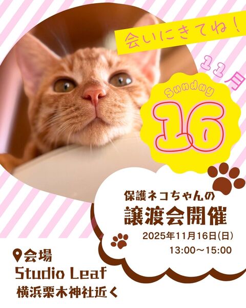 | イベント内容 | PAW STEP主催の保護猫譲渡会!! 根岸線洋光台駅から徒歩7分 『栗木神社』近くのスタジオリーフ 生後3カ月〜成猫まで様々な子がずっとのお家を待っています。 ※駐車場はない為、お近くのコインパーキングにおとめください。 洋光台駅周辺にはオリンピックやイトーヨーカドーなどもあります。 |