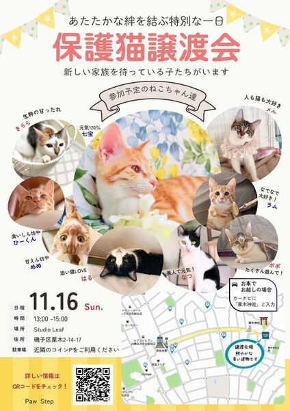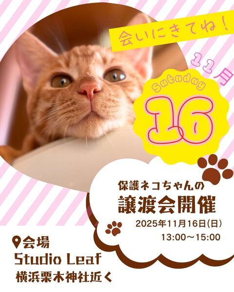 | イベント内容 | PAW STEP主催の保護猫譲渡会 根岸線洋光台駅から徒歩10分 『栗木神社』近くのスタジオリーフ 青い建物が譲渡会場になりますので、 栗木神社近くまで来ていただければすぐにお分かりいただけます。 生後3カ月〜成猫まで個性豊かな子たちがずっとのお家を待っています。 ※駐車場はない為、お近くのコインパーキングのご利用をお願いいたします。 洋光台駅周辺にはオリンピックやイトーヨーカドーなどもあります。 ※当日のお渡しはございません。アンケートの結果やマッチング状況を元に里親様を決定いたします。 予約不要となりますので、保護猫のお迎えをご検討中の方、お気軽にご参加ください。 |