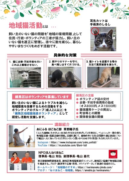 | イベント内容 | 西武池袋線・有楽町線、都営大江戸線「練馬駅」中央北口から徒歩1分 [講演内容] ●地域猫制度・ペット終生飼養相談支援事業の説明 練馬区保健所 ●地域猫活動の方法 NPO法人ねりまねこ ●事例報告 あにふるそとねこ部 ●ディスカッション ペット終生飼養相談支援について 参加費無料 定員100名 【お申込み方法】 以下のリンク、またはQRコードからお申込みフォームにご入力ください。 https://ws.formzu.net/fgen/S193586164/ 主催:NPO法人ねりまねこ 後援:練馬区保健所 _____________ 練馬区で地域猫制度が始まり16年。 野良猫の数は大きく減りました。 次なる課題は、高齢・貧困・孤立などで ペットの飼育の継続が困難になるケース。 練馬区では、今年度より ペット終生飼養相談支援事業が始まりました。 地域社会で、できることを持ち寄り解決する方法を 会場の皆様と一緒に考えてみたいと思います。 関心のある方は、ぜひお越しください。 https://ameblo.jp/nerimaneko/entry-12936599485.html |