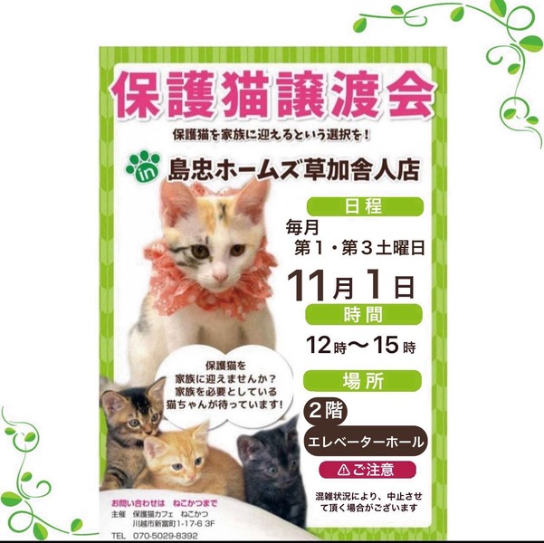| イベント内容 | *保護猫譲渡会* 日時:11/1(土) 12時~15時 場所:ホームズ草加舎人店さま 島忠ホームズ草加舎人店さま譲渡会に参加予定です。 センターからの引き出し、飼育崩壊や所有権放棄などで、生きる場所を失った猫たちが、最大限の医療にかけてピカピカになりました。 写真の猫の他にも甘えっこちゃんたちが、溢れる笑顔でお待ちしています。 ぜひご参加ください。 ***譲渡条件*** *完全室内でお願いします *逸走防止対策にご協力頂ける方 *写真付きの身分証をご提示頂ける方 *LINE若しくはメールでのやりとりが可能な方 *譲渡に関する覚え書きにご署名頂ける方 *初期医療費をご負担頂ける方 *その他の譲渡条件を、譲渡会場でお話させて頂ける方 *猫が生まれた年から20年後に、80歳を超えていない方 *お一人暮らしの方は、後見人さまのご同席が必要です |