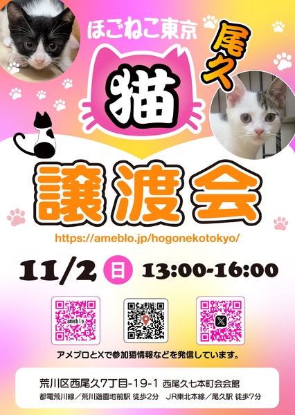 | イベント内容 | とてもアットホームなお見合い会です。 月に数回、尾久や駒込近隣で開催しています。 保護猫譲渡会は子猫希望者が多く、大人猫の希望者はわずかです。 でも保護猫は子猫だけではありません。私たちは大人猫にも幸せに暮らせるお家を見つけてあげたいので保護猫への理解と、真剣に向き合っていただけるご家族様をお待ちしております。 応援よろしくお願いいたします。 ======= ほごねこ東京譲渡会in尾久 11月2日(日) 13時〜16時 西尾久七本町会会館 荒川区西尾久7丁目-19-1 都電荒川線 荒川遊園地前駅 徒歩2分 JR東北本線 尾久駅 徒歩7分 ======= ●予約不要、入場無料です。 ●室内は靴を脱いでいただきます。 ●手指消毒のご協力をお願いいたします。 ●アンケート用紙にご記入ください。 ●お申し込みしたい猫が見つかりましたら、スタッフにお声がけください。生活環境や条件についてヒアリングさせていただきます。 ●お申し込みの有無は保護主が判断します。お話の順番をお待ちいただく事があります。 ●お申し込みの際に、1匹1000円の運営協力金をお願いしております。トライアル(パネル参加の子はお見合い)が成立しない場合も返金はいたしません。 ●トライアル(パネル参加の子はお見合い)決定の有無は後日お電話かSMSにてお知らせいたします。再度ヒアリングさせていただく事がありますのでご了承ください。当日決定はしません。 ●参加予定の猫が欠席、または変更する場合があります。 ======= <基本譲渡条件> ・ペット可物件に居住 ・ご家族全員の同意と面談 ・完全室内飼育(ベランダ、庭、帰省先や旅行先への同伴不可) ・空調などによる室温管理 ・責任と愛情をもって終生飼育 ・適切な医療措置(先住猫についても同様) ・質の良いフードの継続 ・不妊手術の実施と報告 ・脱走や危険防止対策 ・清潔な環境とお部屋の整理整頓 ・全てのお部屋の出入りが自由(特別な場合を除く) ・一部の医療費と支援金のご負担 ・身分証明書を提示と契約書の取り交わし ・写真数枚や動画付きの定期報告 ======= ※お申し込みをお断りさせていただく可能性があるケース ・一般的にご自身で終生飼育が難しい事が予想される方 (20年以上生きる長生きの子が増えています。最後までしっかりお世話する事ができるか、よくお考えください。子猫・幼猫希望は55歳位までを目安としておりますが、徒歩圏内に後見人がいるなど、条件次第で変わります。) ・子猫・幼猫希望でお留守番時間が長い方(お子様や高齢者のみのお留守番は不可です。) ・脱走防止など、安全対策に全面協力していただけない ・自動製品に頼りすぎなど、毎日の健康管理を怠っている ・安定収入(経済力)がない方 ・未成年、単身の方、妊娠中の方、高齢の方 ・個々が経済的に自立していない同棲カップル ・お部屋が狭い、猫が走り回れるスペースを確保できない(譲渡目安:1LDK〜、約40平米〜。猫により狭いお部屋でも可能な場合があります。) ・先住犬、ハイシニアの先住猫がいる ・喫煙者多数、動物に配慮しない喫煙者がいる ・ご家族お揃いで面談ができない(特別な場合を除く) ・お引っ越し予定がある など 保護主や、猫によって希望条件が異なります。 |