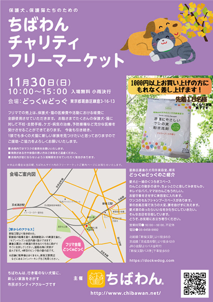 | イベント内容 | 11月30日(日)に葛飾区ドッグカフェ”どっくwどっぐ”にてチャリティフリマを開催することになりました!いぬ親会会場としても利用させて頂いております”どっくwどっぐ”でのチャリティフリマです。 チャリティグッズや全国の皆様がご寄付して下さったフリマ物資を販売させて頂きます! フリマでの売上は、医療費や活動における経費に全額使用させていただいております。おかげさまでたくさんの保護犬・猫に対して不妊去勢手術、怪我や病気の治療、予防接種など、十分な医療を受けさせることができております。今後も引き続き、1頭でも多くの犬猫に新しい家族を見つけたいと思っておりますので、ご援助・ご協力をよろしくお願いいたします。 是非ご家族、お友達と一緒に遊びに来て下さい。思わぬ掘り出し物が見つかるかもしれません! 皆様のご来場をお待ちしています。 【ちばわんからのお願い】 ◆会場内ではマスクの着用をお願いします。 ◆発熱がある方や体調が悪い方は来場をご遠慮ください。 ◆会場内が密にならないよう入場制限をさせていただく場合があります。 【開催日】11月30日 【開催時間】10:00〜15:00 【会場】”どっくwどっぐ”内 【住所】東京都葛飾区鎌倉3-16-13 ※中止の場合は当日に、ちばわんイベントホームページにてお知らせします。 【アクセス】 ≪交通≫ 北総線「新柴又駅」徒歩5分 駅直結の陸橋を渡り、高架線沿いの細道を進みます。(セブンイレブンは店内通り抜けできます)鎌倉公園沿いの細道の突き当りを右に曲がり、すぐに左折してください。道路右側に民家が並んでいます。4軒目のピンク色の壁の店です。 ※店舗には駐車場はありません。当日お車の方は近隣のコインパーキングをご利用ください。 【お知らせ】 今回も1000円以上お買い上げの方にプレゼントをご用意してます! ※数に限りがあります※ どうぞお楽しみに (^o^) チャリティーフリマイベントホームページ https://chibawan.net/event/20251130-flea-market-katsushika ちばわんホームページ https://chibawan.net/ |