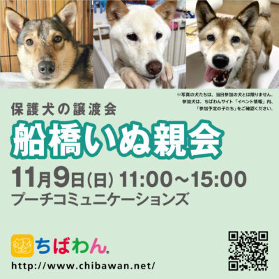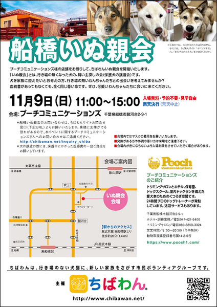 | イベント内容 | 11月船橋いぬ親会のご案内です。 poochさんのご厚意により、プーチコミュニケーションズ(船橋市駿河台)のドッグランをお借りして『船橋いぬ親会』を開催することになりました。 屋根付きのドッグランでの開催になります。 【ちばわんからのお願い】 ◆会場内ではマスクの着用をお願いします。 ◆発熱がある方や体調が悪い方は来場をご遠慮ください。 ◆会場内が密にならないよう入場制限をさせていただく場合があります。 開催日:11月9日(日)11:00~15:00 屋外開催(屋根付きドッグラン) 小雨決行 場所:プーチコミュニケーションズ 千葉県船橋市駿河台2-9-1 【アクセス】 飯山満駅から徒歩約20分 JR東船橋駅から徒歩約20分 県道8号線 吹上交差点~駿河台交差点間にあるファミリーマートの裏手になります。 リサイクルショップとファミリーマートの間の道へ進み、最初のT字路を左折してください。 ※店舗の駐車場は5台分のみとなりますので混雑時にはご利用いただけない場合がございます。 満車の場合はコインパーキングをご利用下さい。 《お知らせ》 ◆会場ではチャリティグッズを販売します 売上金は保護した犬猫の医療費など、 ちばわん活動費として大切に使わせていただきます 《お問い合わせ》 いぬ親会について:http://chibawan.net/inquiry_chiba ※いぬ親会当日はメールが見られません。また、お問い合わせの際は、必ず「具体的な件名」を入れて多数の迷惑メールと区別がつくようにお願いいたします。 ※本イベントに関するPoochさんへのお問い合わせはご遠慮ください。 船橋いぬ親会イベントホームページ https://chibawan.net/event/20251109-funabashi-dog ちばわんホームページ https://chibawan.net/ |