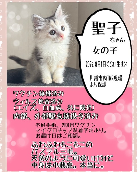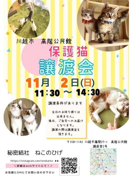 | イベント内容 | 【秘密結社ねこのひげ☆保護猫譲渡会】 11/2(日) 11:30~14:30 川越市高階公民館 講座室2号 (〒350-1142 埼玉県川越市藤間27-1) ⊰᯽⊱┈──╌❊╌──┈⊰᯽⊱ 初期医療を済ませ 巣立ちの準備が整った 春生まれ夏生まれの仔猫たちが 続々と譲渡会デビューします♪ 小童どもには負けへんでー! な、もっふもふなオトナっ仔も参加♪ 一同笑顔いっぱいで譲渡会に挑みます♪ 未来のずっとのご家族さまと 愛し愛されな両想いになれますように♡ 是非会いにいらしてくださーい♪ ヾ(*´∀`)ノ もちろん見学だけでもWelcomeです♪ ご不明な点がございましたら Instagram➡@nnnkanto DMにてお問い合わせください☆ |