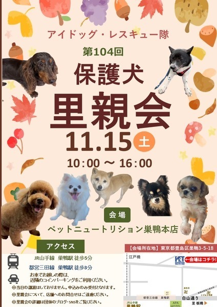 | イベント内容 | 第104回アイドッグ里親会(巣鴨)のお知らせ 以下の通り、里親会を開催します。 ・日時:11月15日(土) 10:00 ~ 16:00 ※入れ替え制 (10:00〜13:00/13:00〜16:00) ・会場:ペットニュートリション巣鴨本店 東京都豊島区巣鴨3-5-18 ・最寄駅 JR山手線 巣鴨駅より徒歩5分 都営三田線 巣鴨駅より徒歩3分 ※お車でお越しの際は、近隣のコインパーキングをご利用ください。 ※会場内は密になりやすいため、マスクの着用は自己責任にてご判断お願いします。 〜皆様のお越しをお待ちしています〜 |