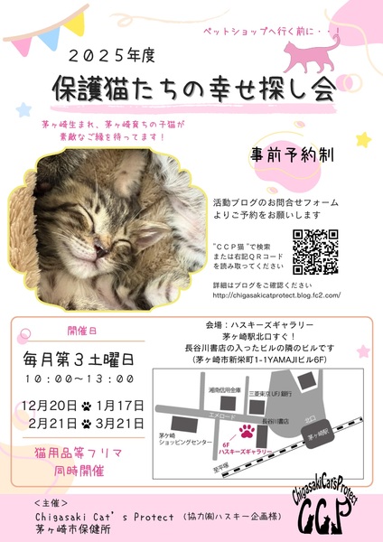 | イベント内容 | 神奈川県茅ケ崎市内のみで活動している猫専門保護団体 Chigasaki Cat's Protect主催の保護猫たちの幸せ探し会(里親会)情報です。 参加猫さん情報等は当会ブログよりご確認ください。 http://chigasakicatprotect.blog.fc2.com/ 【yahooで「Chigasaki Cat's Protect」「CCP猫」で検索可能】 茅ヶ崎市内で保護された猫さんが参加します。 幸せ探し会は毎月第3土曜日に開催しております。 屋内開催なので天気に左右されずに開催中♪ ◆会場:茅ヶ崎駅北口徒歩1分ハスキーズギャラリー 〒253-0044 神奈川県茅ヶ崎市新栄町1-1YAMAJIビル6F ◆時間:11月15日(土)午前10時~午後1時まで (12時半までにご来場ください) 毎月第3土曜日に開催致します。 0歳~1歳までの猫さんたちが 素敵な家族とのご縁を待っております。 ※譲渡条件があります ※当日お引き渡しはありません。後日ご自宅へメンバーがお届けとなります。 ※お見合い希望の猫さんがいるが当日ご都合が悪い場合はお問い合わせください。他の日にお見合い可能です。 ◆譲渡範囲があります◆ 【成猫の場合:神奈川】 (茅ヶ崎から車で30分以内に搬送出来るエリアに限らせていただきます) 【生後半年未満の子猫の場合:神奈川県内】 (片道30分以内で搬送できるエリアに限らせていただきます) ※個体によっても譲渡範囲が変わってきますのでお問い合わせください。 CCP活動ブログ http://chigasakicatprotect.blog.fc2.com/ メールでのお問い合わせ chigasakicatprotect@yahoo.co.jp |