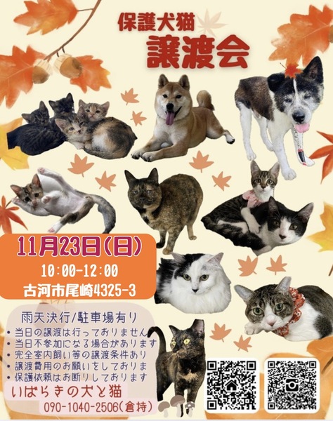 | イベント内容 | 保護犬猫を家族に迎えてみませんか? ずっとのおうちを待っています 小さな譲渡会なのでとってもアットホーム☻ 迎えたい方も会ってみたい方もどなたでも大歓迎です♪ 保護っ子 元気いっぱいお待ちしております!! 予約不要/雨天決行/駐車スペース有 (開催場所が分かりにくいので下記の連絡先までご連絡頂ければご案内致します) ※譲渡条件などありますので当会の里親募集ページやHPをご確認ください※ 【不要になったフード(未開封).タオル.ペットシートなどありましたら、ご寄付いただけると助かります】 ⚫︎お問合せ⚫︎ 電話▷090-1040-2506 (クラモチ) LINE ID▷ 717217 (モトハシ) |