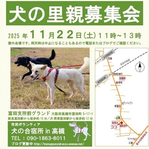 | イベント内容 | ※屋外会場での里親募集会です。 雨天時は中止にする可能性がありますので電話でご確認ください。 犬によっては別会場をご案内できる場合があります。 (電話でのお問合せ→090-1863-8011) ※先住ワンちゃんを連れて会いに来て頂けます。相性を見るためにも、是非是非、連れてきてください。 ※近付きましたら「犬の合宿所in高槻」のブログでも参加予定犬等の情報を紹介していきます。 ➡ http://inunogassyukusyo.seesaa.net/article/518873886.html 予約は不要ですが、参加犬が直前に変更する場合がありますので、会いたいワンちゃんが決まっている場合は事前にご確認頂く方が確実かと思います。 【お問合せ】 090-1863-8011 ・・・・・・・・・・ 【アクセス】 ・阪急京都線 富田駅から徒歩約10分 ・JR京都線 摂津富田駅から徒歩約12分 ※隣接する富田支所と公民館の駐車場は使えませんが、会場広場内に駐車できる場合があります。 事前にご確認ください。(090-1863-8011) ・・・・・・・・・・ 市民ボランティア「犬の合宿所in高槻」は、現地での譲渡が難しい離島の保健所収容犬を引き取り関西で新しい飼い主探しをしています。 保護犬を家族として迎えることが文化として定着し、生体販売に伴う悲惨な繁殖犬の存在がなくなることを願っています。 ・・・・・・・・・・・・・・・・・・・・・・・・・・・・・ ★ 一時預かりさんや犬の搬送ボランティアさん、里親募集会の当日お手伝いの方など常時募集しています。 ★犬によっては個別お見合いできる場合があります。 里親募集会に参加できない方で個別お見合いをご希望の方は、預かりさんとの日程調整が必要ですので、電話でお問合せください。⇒090-1863-8011 |