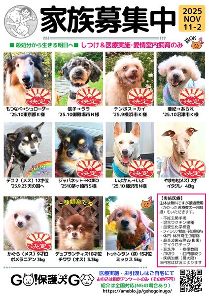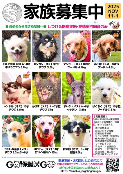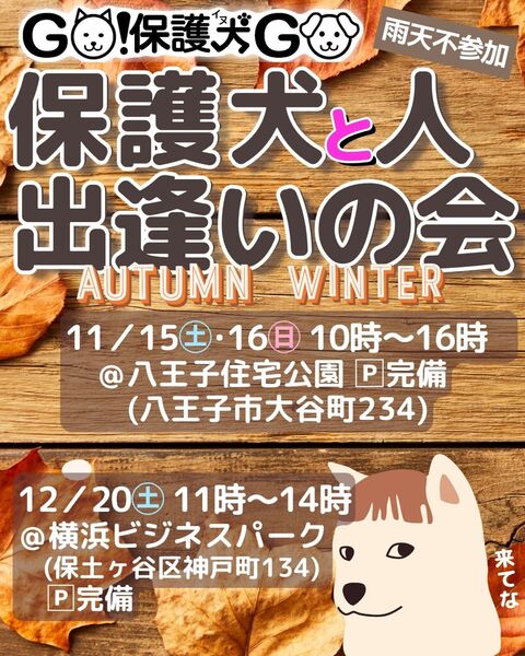 | イベント内容 | とき:11月15日、16日 時間:10時~16時 場所:八王子住宅公園(八王子市大谷町234) ?完備 おトイレのしつけができた保護犬と出逢いませんか? 住宅展示場内での楽しいイベントです 無添加ワンちゃん用おやつ、全国から寄せられた犬服も販売します 保護犬を迎えたい、と思ったら一つの選択肢として遊びに来てくださいね |