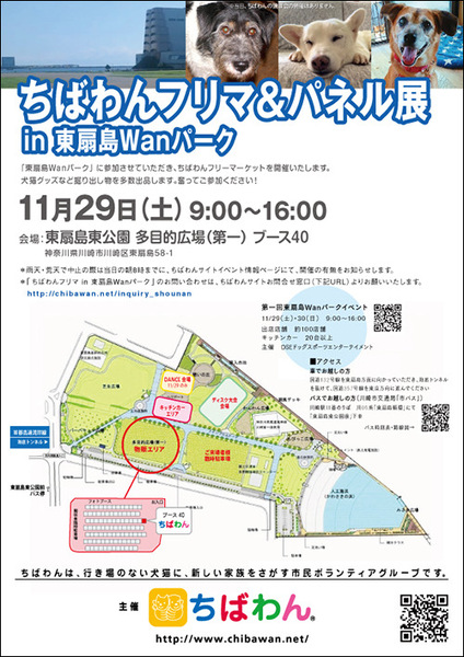 | イベント内容 | 東扇島Wanパーク・DOGEVENT ちばわんブース参加します! 【フリマ&パネル展】9:00〜16:00 会場:川崎市・東扇島東公園 雨天決行(悪天中止) ※雨天・荒天で中止の際は当日の朝8時までに開催の有無をお知らせします。 わんこ関連の出店やキッチンカー、ドッグランやデモンストレーションなど、 わんこ連れで楽しめるドッグイベントです! 出店店舗100店舗 キッチンカー 20台以上 主催: DSE イベント協力 東扇島東公園 ● 会場では、ちばわんオリジナルチャリティグッズの販売やフリマ販売も行います! 売上金は保護した犬猫の医療費など、ちばわん活動費として大切に使わせていただきます ※「ちばわん in 東扇島Wanパーク」のお問い合わせは こちらへお願いいたします:問合せ先 ※イベント当日はメールが見られません。 また、お問い合わせの際は、必ず「具体的な件名」を入れて多数の迷惑メールと区別がつくようにお願いいたします。 ※当日の雨天・荒天での中止は主催者Instagramよりご確認ください。https://www.instagram.com/wan_park_dse/ 【アクセス】 バス 川崎駅東口から川05系「東扇島循環」で「東扇島東公園前」下車 クルマ 国道132号線を東扇島方面に向かっていただき、 海底トンネルを抜けて、国道357号線を東京方向に進んでください。 |
