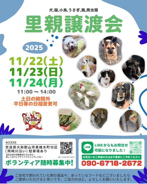 | イベント内容 | イベント内容 \11月22日23日24日に譲渡会を開催します/ 子犬や子猫、小型犬から大型犬、かわいい猫ちゃんたちまで、たくさんの保護犬・保護猫が皆さんを待っています! 写真だけでは伝えきれない魅力が盛りだくさんなので、ぜひお気軽に足を運んでくださいね。 【里親募集中の犬猫情報はコチラ】 https://satoya-boshu.net/foster/?@button_name@=search&FosterParent_MemberID=85262 ●事前にお電話かショートメールでご予約をお願いします。 ・予約番号:090-6718-2672 ●ご希望の犬猫がいましたら、予約時に名前をお伝えください。 ●当日までに譲渡が決定した・体調がすぐれないなど、やむを得ない理由で急きょ不参加の場合があります。ご了承ください。 ●その場での引き渡しはしておりません。譲渡決定後、距離にかかわらずこちらからお届け致します。 みなさまのご来場をお待ちしております! ⚫︎りぼんは、奈良県で活動している動物保護団体です。 犬・猫・うさぎなどの小動物・インコやニワトリなどの鳥・両生類・爬虫類など動物種を問わず、お届け先も地域を問わず、動物たちと里親さまをつなぐ活動を行っています。 ◎ホームページ https://ribbon-foster.jimdofree.com/ ◎公式YouTube https://www.youtube.com/@ribbon-shelter https://www.instagram.com/ribbon_shelter1/ |
