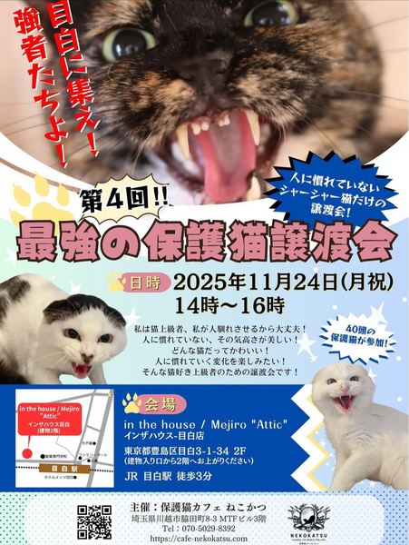 | イベント内容 | ◆保護猫カフェねこかつさんの譲渡会です <目白に集え!強者たちよ!> 第4回!最強の保護猫譲渡会開催のお知らせ 猫はどんな猫だってかわいい! 『人に慣れていない』その気高さがいい! 私が慣れさせるから大丈夫! 人に慣れていく変化を楽しみたい! 人に慣れていないのはそれだけつらい過去があったということ。 そのつらい過去ごとすべて私が受け止めるわ! 私だって人付き合いが苦手だもの。 そんな私と、これから一緒に生きていきましょう! そんな猫上級者に向けた、 人に慣れていない "シャーシャー猫だけ”の譲渡会を開催します。 ■日程 2025年11月24日(月祝) ■時間 14時~16時 ■会場 in the house / Mejiro "Attic" ■住所 東京都豊島区目白3-1-342F (JR「目白駅」徒歩3分、線路沿いのスタジオです。) シャーシャー猫ばかり約40頭が参加します。 抱っこ大好きな猫/甘えん坊の猫 懐っこい猫/里親希望の多い子猫は1頭もいません。 ぜひお立ち寄りください! 会場はチャリティーグッズの販売もあります! 『2026ねこかつチャリティーカレンダー』も販売! 収益は全額保護猫の医療費などに寄付され、シャー猫たちの支援と応援につながります |