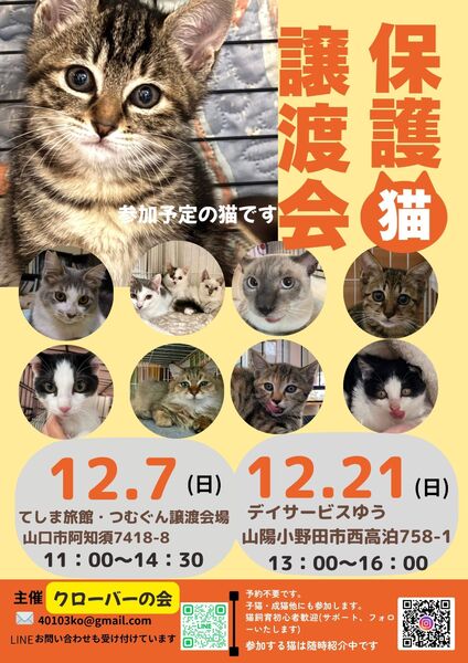 | イベント内容 | 猫ちゃんと触れ合える譲渡会です。 猫の温もりに癒されてみませんか。 猫飼育始めての方も多くご来場いただいています。 出来る限りのフォローサポートさせていただきます。 猫との生活始められませんか。 お時間調整の上、是非ともご来場ください? 譲渡会までに個別面会可能な子もいます。 気になる子、D Mからお問い合わせください。 猫を保護して里親探しをしている方、譲渡会に一緒に参加しませんか。インスタDMからお問い合わせお願いします。 Instagram https://www.instagram.com/kurobanokai/ #譲渡会 #保護猫 #山口市#美祢市 #宇部市 #防府市#萩市#山陽小野田 #子猫 #成猫 #つむぐん譲渡会 #クローバーの会 |