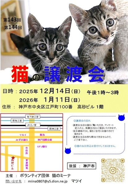 | イベント内容 | まだお家の決まらない猫たちが参加をして、新しい家族を探しています(=^・^=) 猫は後日こちらからお届けをさせて頂き、お家の環境と脱走防止を見せて頂ければと思います。 仔猫は20年くらい生きる子もいますので、ご自身の年齢に合った猫さんとの出会いを探しに来てください。 ペット不可にお住まいの方はご遠慮くださいね。( ご確認してください。) 譲渡には条件が多数ありますので、ご理解くださいませ<m(__)m>。 まずはお試し(トライアル)で猫との相性を見てから、1ヶ月後に正式譲渡となります。 また、猫を保護して里親を探そうと思われている保護者の方も、〖 譲渡会に参加ねこの募集 〗をしていますので、お申し込み頂けます。 アドレス miina0807@y5.dion.ne.jp にご連絡をください。 お越しの際は各路線の三宮駅からは徒歩10分くらい、車でお越しの場合は近隣のコインパーキングなどにお停めください。 当日、体調の悪い方、発熱がある方、そんな症状の方は遠慮頂ければと思います。 定例の毎月は第2日曜日に譲渡会を開催しておりますので、次回の出会いに期待をしてくださいね。 ブログ: 猫のミーナといっしょ http://miina300.blog.fc2.com/ インスタ:nekono_mina |