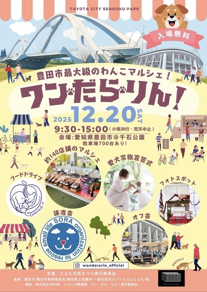 | イベント内容 | とよた元気まつり『ワン・だら・りん!』に一般社団法人SORA小さな命を救う会も参加させていただきます。 * お見合い会、チャリティー福引(アンケートにお答えください)、ガチャガチャ(ワンコグッズ)、チャリティーグッズ販売 * 雨天決行・荒天中止 収益は、全て保護犬の医療など保護活動使わせていただきます。 是非、ご家族みなさんで遊びに来てくださいね。 SORA公式ホームページ https://sora-chiisana.org/foster/ SORA公式活動メインブログ https://ameblo.jp/sora-chiisana-inochi/ SORAイベントブログ https://ameblo.jp/sora-charity-events/ |