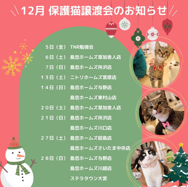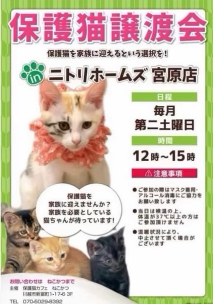 | イベント内容 | 保護猫カフェねこかつさん主催の保護猫譲渡会です☺︎ ちびっ子や大人猫ちゃんがたくさん参加します! てぃーるーむからは子猫も参加予定です❤︎ どなた様もご自由にご参加いただけます*♪ ❁譲渡には譲渡条件がございます ❁お申込みの際にはアンケートへのご記入がございます ❁当日に猫ちゃんを連れて帰ることはできません |