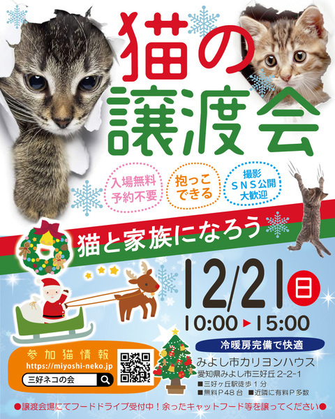 | イベント内容 | 2025年最後の譲渡会です♪ 10月生まれの子猫3-4匹参加予定。全部で25匹くらいになりそうです! 新年を新しい家族と迎えませんか!? ネコが家族みんなを楽しく幸せにしてくれますよ♪ ※参加猫、匹数は12月15日頃にお知らせします。 〇◎2025年ラスト譲渡会★みよし市◎〇 ■12月21日(日)10時~15時 ■みよし市カリヨンハウス(みよし市三好丘2-2-1) ※無料P48台、近隣に大型コインPあり <参加団体> NPO法人三好ネコの会 https://www.instagram.com/miyoshineko あいち東郷ねこの会 https://www.instagram.com/togoneko2 猫暖心 https://www.instagram.com/nekodangonet <ご来場前に> ・猫は先着や申入れの順番ではございません。 ・適正と条件を十分考慮させて頂き、トライアル先は抽選で決まります。 ・当選されたご家庭のみに当日電話連絡を差し上げます。 ・体調不良等で不参加になる猫もございます。 ●子猫譲渡手数料 ワクチン1回接種/1匹20,000円・2匹38,000円 ワクチン2回接種/1匹30,000円・2匹58,000円 ●成猫/オス30,000円・メス35,000円 ※成猫は不妊去勢済、ワクチン済です。 ※個人参加猫、他団体猫は上記手数料ではございません。 ■主催:NPO法人三好ネコの会 インスタ、Facebook、HPなどのSNSはこちら https://miyoshi-neko.jp/sns |