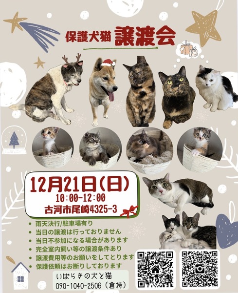 | イベント内容 | 保護犬猫を家族に迎えてみませんか? ずっとのおうちを待っています 小さな譲渡会なのでとってもアットホーム☻ 迎えたい方も会ってみたい方もどなたでも大歓迎です♪ 保護っ子 元気いっぱいお待ちしております!! 予約不要/雨天決行/駐車スペース有 (開催場所が分かりにくいので下記の連絡先までご連絡頂ければご案内致します) ※譲渡条件などありますので当会の里親募集ページやHPをご確認ください※ 【不要になったフード(未開封).タオル.ペットシートなどありましたら、ご寄付いただけると助かります】 ⚫︎お問合せ⚫︎ 電話▷090-1040-2506 (クラモチ) LINE ID▷ 717217 (モトハシ) |