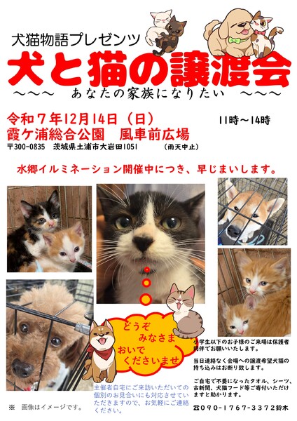 | イベント内容 | 土浦市の霞ヶ浦総合公園で開催しています、 犬と猫の譲渡会です。 毎回、色んなところからの家族を探す犬猫が参加します。 あなたとの出会いを待つワンニャンにぜひ会いにきてくださいませ。 11時~14時開催です ●犬猫物語は土浦を中心とし保護活動、野良猫の避妊去勢などを行っている団体です。 犬猫の相談などはお電話くださいませ。 譲渡会への猫の参加も受け付けております。 当日いきなりの参加は不可能ですが、事前にご連絡ください。 お待ちしています(^^ 問い合わせは09017673372鈴木まで。非通知には出ません |