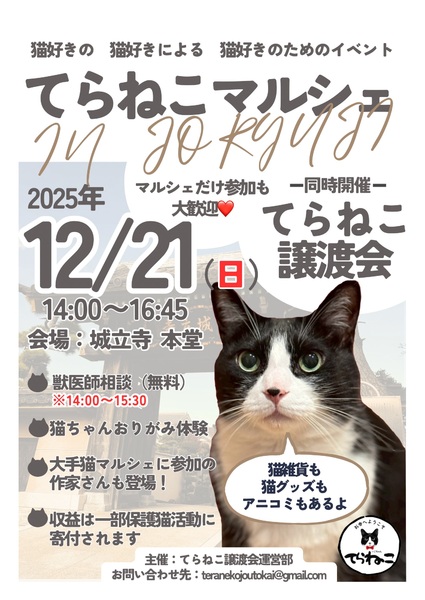 | イベント内容 | 子猫から成猫まで、たくさんの猫ちゃんが参加します。 5回目となる「てらねこマルシェ」も同時開催! 猫雑貨、アニマルコミュニケーションなど、猫好き以外も楽しめるイベントになる予定。 最新情報はInstagramで発信しています‼️ てらねこ譲渡会は、江戸川区支援ボランティアが運営を担い、区外の保護主にも門戸を開き、季節のお花に囲まれた美しいお寺、城立寺様のご協力の下、開催しています。 単身者、高齢者の方など、なかなかお迎えが叶わない方もご相談ください。 子猫から成猫までたくさんの可愛い猫ちゃんが参加します(体調不良の場合、予告なく不参加になる場合があります) 【第19回 てらねこ譲渡会】 日時:2025年12月21日(日) 14:00~17:00 (受付13:45/最終受付16:30) 会場:城立寺(じょうりゅうじ) 住所:江戸川区春江町2-39-28 https://maps.app.goo.gl/rE7j8HNxzK1VV3rAA?g_st=com.google.maps.preview.copy ・公共機関でお越しの場合 都営新宿線「瑞江駅」から徒歩12分 JR小岩駅から京成バス「小76」 バス停「名主屋敷」から徒歩すぐ ※敷地内に駐車スペースがあります(満車の際は近隣にコインパーキングもあります。 |