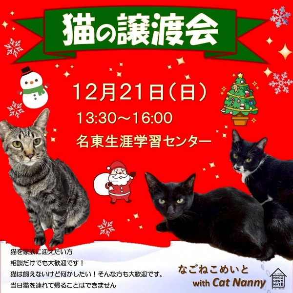 | イベント内容 | 可愛い保護猫ちゃん達が大集合! 子猫から、しっとり落ち着いた成猫まで、甘えん坊が皆さまのご来場をお待ちしています♪ 見てるだけで癒されること間違いなし 予約不用、入場料無料 譲渡会が初めての方もお気軽にお越しください。 気さくなスタッフがご案内させて頂きます。 |