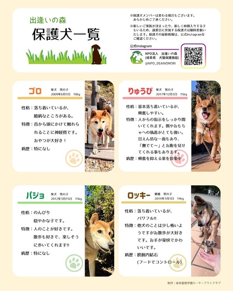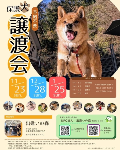 | イベント内容 | 出逢いの森の犬たちの譲渡会を開催します! 個性豊かな犬たちにぜひ会いに来て下さい! 14:30 受付開始 14:45 説明会 15:00 ふれあい・見学 16:00 終了 予約は不要です。 当日に犬を連れて帰ることは出来ません。 ※以前説明会にご参加していただいた方は、説明会参加不要です。15:00までにお越しください。 ※当日の体調等により、写真の保護犬がいない場合もございます。予めご了承ください。 譲渡会に参加の際、任意のご寄付を500円からお願いしております。 参加犬や譲渡条件、会場へのアクセスなどの詳細は、「出逢いの森」ホームページをご覧ください。 https://deaimori.com/foster-parents/ |