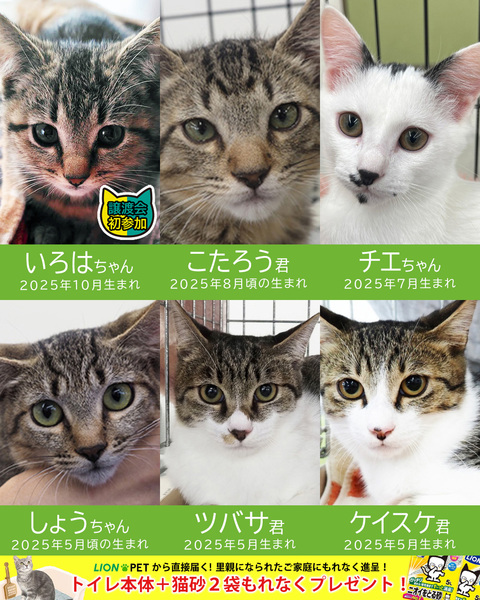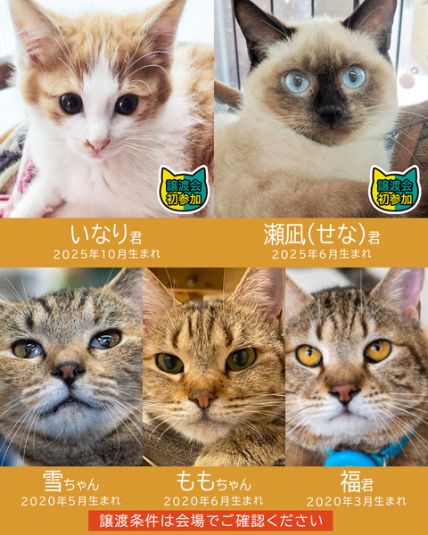 | イベント内容 | 2026年初猫譲渡会の参加ねこが決まりました。 初参加子猫含む18匹がエントリー♪子猫は10月生まれです♪ 2026年は家に猫を迎えて猫年、猫飼い元年にしませんか? カワイイ猫たちが新しい家族のお迎えをお待ちしています。 ▼▼▼参加猫▼▼▼ http://miyoshineko.sblo.jp/article/191581562.html ――――――――――― カワイイネコ18匹の譲渡会 ――――――――――― 2026年1月4日(日)10時~15時 みよし市カリヨンハウス(みよし市三好丘2-2-1) ※無料P48台、近隣に大型コインPあり 【参加団体】 NPO法人三好ネコの会 https://www.instagram.com/miyoshineko あいち東郷ねこの会 https://www.instagram.com/togoneko2 猫暖心 https://www.instagram.com/nekodangonet 【ご来場前に】 ・猫は先着や申入れの順番ではございません。 ・適正と条件を十分考慮させて頂き、トライアル先は抽選で決まります。 ・当選されたご家庭のみに当日電話連絡を差し上げます。 ・体調不良等で不参加になる猫もございます。 ●子猫譲渡手数料 ワクチン1回接種/1匹20,000円・2匹38,000円 ワクチン2回接種/1匹30,000円・2匹58,000円 ●成猫/オス30,000円・メス35,000円 ※成猫は不妊去勢済、ワクチン済です。 ※個人参加猫、他団体猫は上記手数料ではございません。 <もったいないを保護猫に> ご家庭で余っているフードを譲渡会場でお受け取りできます 買ったけど食べてくれない、飼い猫が亡くなって残ってしまったなど キャットフードドライブにご寄贈をお願いします。 ■主催:NPO法人三好ネコの会 インスタ、Facebook、HPなどのSNSはこちら https://miyoshi-neko.jp/sns |