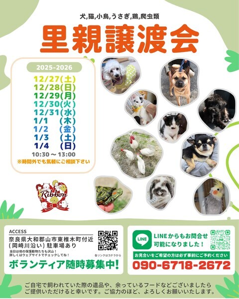 | イベント内容 | イベント内容 \12月27日~1月4日に譲渡会を開催します/ 子犬や子猫、小型犬から大型犬、かわいい猫ちゃんたちまで、たくさんの保護犬・保護猫が皆さんを待っています! 写真だけでは伝えきれない魅力が盛りだくさんなので、ぜひお気軽に足を運んでくださいね。 【里親募集中の犬猫情報はコチラ】 https://satoya-boshu.net/foster/?@button_name@=search&FosterParent_MemberID=85262 ●事前にお電話かショートメールでご予約をお願いします。 ・予約番号:090-6718-2672 ●ご希望の犬猫がいましたら、予約時に名前をお伝えください。 ●当日までに譲渡が決定した・体調がすぐれないなど、やむを得ない理由で急きょ不参加の場合があります。ご了承ください。 ●その場での引き渡しはしておりません。譲渡決定後、距離にかかわらずこちらからお届け致します。 みなさまのご来場をお待ちしております! ⚫︎りぼんは、奈良県で活動している動物保護団体です。 犬・猫・うさぎなどの小動物・インコやニワトリなどの鳥・両生類・爬虫類など動物種を問わず、お届け先も地域を問わず、動物たちと里親さまをつなぐ活動を行っています。 ◎ホームページ https://ribbon-foster.jimdofree.com/ ◎公式YouTube https://www.youtube.com/@ribbon-shelter https://www.instagram.com/ribbon_shelter1/ |