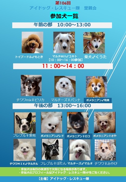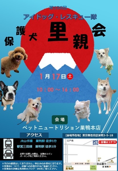 | イベント内容 | 第106回アイドッグ里親会(巣鴨)のお知らせ 以下の通り、里親会を開催します。 ・日時:1月17日(土) 10:00 ~ 16:00 ※入れ替え制 (10:00〜13:00/13:00〜16:00) ・会場:ペットニュートリション巣鴨本店 東京都豊島区巣鴨3-5-18 ・最寄駅 JR山手線 巣鴨駅より徒歩5分 都営三田線 巣鴨駅より徒歩3分 ※お車でお越しの際は、近隣のコインパーキングをご利用ください。 ※会場内は密になりやすいため、マスクの着用は自己責任にてご判断お願いします。 ※犬をお連れの方は、オムツやマナーベルトをご着用ください。 フリーで遊ばせることは出来ませんので、リードの着用をお願い致します。 〜皆様のお越しをお待ちしています〜 |