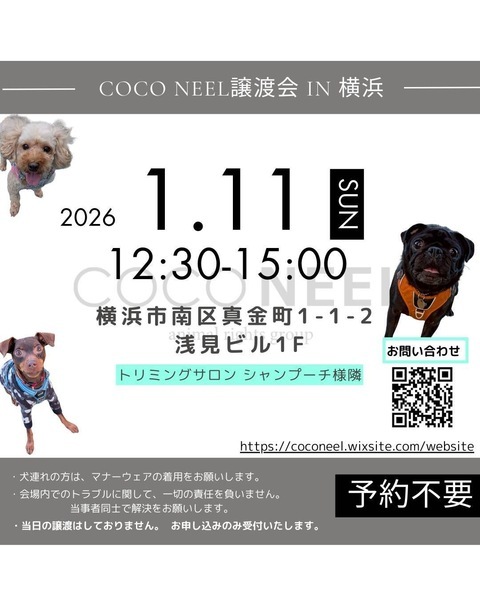 | イベント内容 | ・ ・ COCO NEEL 譲渡会 @横浜 2026.1.11(日)12:30〜 15:00 ⚠参加犬は決まり次第お知らせします- ̗̀? ━━━━━━━━━━━━━━━ ?会場 横浜市南区真金町1-1-2 浅見ビル1F ?️の用意はありません? 近隣のコインパーキングのご利用をお願いいたします。 ????市営地下鉄ブルーライン阪東橋駅1A出口より徒歩10分 ━━━━━━━━━━━━━━━ 会場にてお見合いをご希望の方は、譲渡条件をよくご確認のうえ、里親希望エントリーフォームより事前エントリーお願いします。 詳細はHP、ブログからご確認ください。 ━━━━━━━━━━━━━━━ ?COCO NEELオリジナル チャリティーグッズを譲渡会特別価格にて販売します! 冬用犬服▪️犬用おもちゃ▪️雑貨も販売します! ※売上は保護っ子達の医療費・活動費として大切にお預かりさせていただきます?♀️ ご協力お願いいたします。 ━━━━━━━━━━━━━━━ ⚠お願い⚠ ・ワンコ連れの方はマナーウェアの着用をお願いします。 ━━━━━━━━━━━━━━━ #お問い合わせはhpからお願いします #コメントDM対応しておりません ━━━━━━━━━━━━━━━ #coconeel #coconeel保護犬 #ココニール #ここにいる #保護犬 #里親募集 #里親募集中 #譲渡会 |