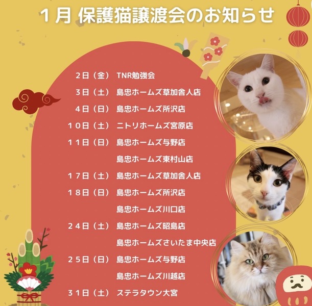 | イベント内容 | 保護猫カフェねこかつさん主催の保護猫譲渡会です☺︎ ねこかつさんや個人ボランティアさんの元で大切にお世話された、ちびっ子や大人猫ちゃんがたくさん参加します ⭐︎島忠ホームズ所沢店様では、ボニズハウスさんより売り上げが保護猫活動へ寄付される、猫グッズのチャリティー販売もございます どなた様もご自由にご参加いただけます*♪ ❁譲渡には譲渡条件がございます ❁お申込みの際にはアンケートへのご記入がございます ❁当日に猫ちゃんを連れて帰ることはできません |