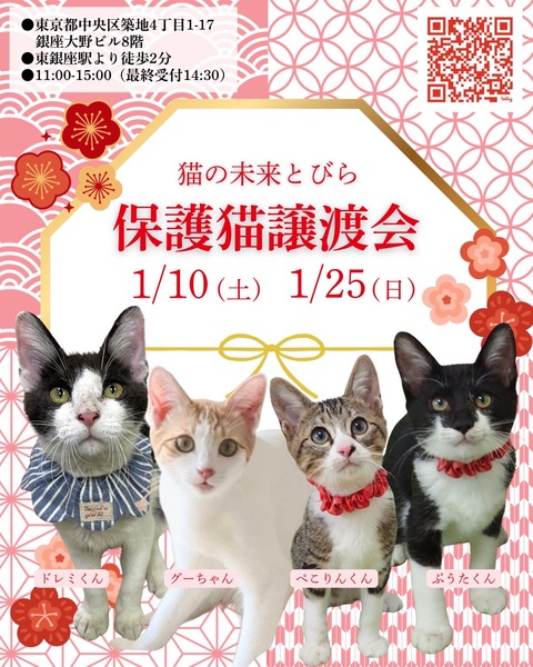 | イベント内容 | 東銀座で保護猫の譲渡会を開催しています「猫の未来とびら」です♪ 恵まれない環境にいる猫たちが未来へのとびらを開いて幸せなご縁に繋がる橋渡しをしていきます。 たくさんの猫ちゃんと保護主・スタッフ一同みなさまのご来場を心よりお待ちしています! 子猫ちゃん〜成猫ちゃんまで参加します♪ 【ご来場いただく皆様には下記についてお願い致します】 ★不織布マスクを着用するしないは自己判断でお願い致します。 ★譲渡会場にお入り頂く前に手洗いと手の消毒をお願い致します。 ★熱のある方や体調の優れない方は譲渡会への来場を見合わせて頂けますよう、お願い致します。 ★来場者数によりましては人数制限もありますので長時間お待たせてする場合もございます。 予めご了承下さい。 ★☆★★☆★★☆★★☆★★☆★★☆★★☆★★☆★★☆★ ★開催日時 2026年1月10日(土) 11:00~15:00(最終受付 14:30) ★会場 東京都中央区築地4-1-17 銀座大野ビル 8階 (東劇となり) ★最寄駅 東銀座駅 6番出口 徒歩2分 銀座駅 徒歩9分 ・築地駅 徒歩7分 駐車場は当ビル又は近隣のコインパーキング等をご利用ください。 会場への直接のお問い合わせはご遠慮くださいませ。 ★☆★★☆★★☆★★☆★★☆★★☆★★☆★★☆★★☆★ 会場で猫ちゃんと触れ合ってご縁を繋いでください。 里親様・猫ちゃんが双方、幸せな家族になれるよう保護主・スタッフがサポート致します。 ご不安な事はお気軽にご相談ください。 入場無料です。事前のご予約は不要です。 当日猫ちゃんの引き渡しはございません。 後日、保護主が里親様宅へお届けいたします。 ※参加予定猫ちゃんは、急な体調不良等で不参加になる場合もございます。 開催当日の朝、当会ブログにて不参加の最新情報を掲載致しますのでご確認をお願い申し上げます。 ◇譲渡に関してのお願い・基本条件 1.家族の一員として終生最期まで愛育下さい。 2.完全室内飼い・ペット可のお住まい(契約書を拝見致します) 3.脱走防止対策 4.避妊・去勢手術 5.里親様のご自宅へのお届け 6.譲渡誓約書への署名捺印・身分証明書の提示 7.医療費譲渡金のご負担 8.定期報告 9.トライアル期間有り ※保護主により譲渡条件は異なりますので会場で直接ご相談ください。 60才以上の方のみのご家庭、未成年の方、単身の方、同棲中の方、 小学生低学年以下のお子様のいる方、必要な脱走対策を施していただけない方は譲渡をご遠慮頂く場合もございますのでご了承ください。 仔猫の場合は主にお世話される方のご年齢は55歳までとさせて頂きます。 オーバーする方はご相談くださいませ。 小さな子猫の譲渡は体重が1kgになってからのお届けやお留守番の無い(少ない)ご家庭を希望いたします。 医療費譲渡金に関しましては詳しくはホームページの 【譲渡に関してのお願い】【譲渡の流れ】をご覧くださいませ。 ~主催 猫の未来とびら~ |