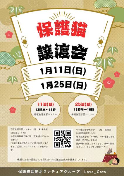 | イベント内容 | 名古屋西部で活動するボランティア個人グループです。 保護した子猫から成猫まで 可愛い子たちがお待ちしています。 予約無しで来ていただけます。 《参加費無料》 今すぐ飼えない方も見に来ていただいて大丈夫です。 是非会いに来てください 子猫から成猫まで可愛い子がお待ちしています ゆったりとした会場でゆっくりみていただけます。 保護してから大切に大切に育てています。 ずっとのお家、優しいご家族に出会える日を待っている子達です 譲渡についての詳しいお話は会場で相談させていただきます |