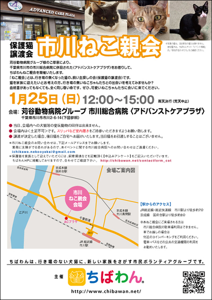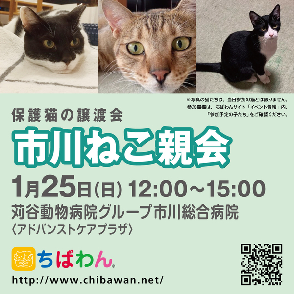 | イベント内容 | 苅谷動物病院様のご厚意により、千葉県市川市の市川総合病院にに併設された<アドバンストケアプラザ>をお借りして、「ちばわんねこ親会」を開催いたします。 是非カワイイねこたちに会いに来てください♪ ※会場は土足禁止です。室内履きをご持参ください。 ※ポスターの猫が参加するとは限りません。参加猫に関してはHPのイベント情報をご覧ください。 ※会場への直接のお問い合わせはご遠慮ください。 <アクセス> JR総武線・総武快速線 市川駅より約徒歩7分 京成線 国府台駅より約徒歩8分 ※ねこ親会にご来場される方は市川橋病院の駐車場は利用できません。 車でお越しの際は、付近のコインパーキングをご利用ください。 路上駐車は絶対にお止めください。 駅からも近い場所ですので電車・バスなどの公共の交通機関の利用をお勧めいたします。 |
