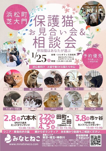 | イベント内容 | みなとねこが毎月定期開催している譲渡会です 今回はお見合い会&相談会として少人数でいろいろご相談いただく会となります。 参加猫はご指名があった猫となります。ご予約時にご指名をお願いします。 ※ご予約後に参加調整を行います 通常の大きな譲渡会ではなかなか相談しづらい、という方も多いので、、、 たくさんの猫を見てみたいという方はぜひ 2/8(日)六本木ミッドタウン をご検討ください。 浜松町駅から徒歩6分、大門駅A4出口より徒歩1分の会場での開催となります。 ※当日はみなと区民まつりが開催されておりますので、ご注意ください ご予約はみなとねこのHPよりお願いします https://www.minatoneco.com/event 会場や参加猫の詳細はこちら https://www.minatoneco.com/gallery ※参加猫たちの様子はみなとねこの各種SNSもご覧ください https://linktr.ee/minatoneco 子猫は2匹ペアでの譲渡が原則です 初めての方こそ最初から2匹をお勧めしています また私たちボランティアは、ご縁のあった猫たちに終生里親様に愛されて幸せに安全に暮らして欲しいと願っています このため里親になっていただくにはいくつかの条件やお約束事があります。 ◆基本条件 (猫それぞれ、保護主により異なります) ・ ご家族全員が飼育に賛成であること ・ペット可物件での完全室内飼い、エアコンなどによる室温管理、医師の指示に従い定期的な受診やワクチン接種、 適切な時期(生後4ヶ月中)での避妊去勢、病気予防に配慮したフードの選択、終生飼養をお願いしております。 ・ケージのみの飼育、リビング以外の一室のみでの飼育は不可です。十分な運動のスペースと窓から景色が眺められのんびり日向ぼっこが可能な環境が望ましいと考えています。 ・誤食などの事故防止のため、お部屋の整理整頓や脱走防止にも万全の対策をお願いします。 ・換気が十分でない室内での喫煙をされる方はお断りしております。 ・日々のお世話だけでなく、スキンシップが可能な精神的・時間的・経済的な余裕がある方に限らせていただきます。猫が20年以上生きる中でなるべく変わらぬ環境で愛情を注いで頂けるよう、家族構成やお仕事、お住まいに変化のない方を優先させていただきます。 またお届けやフォローの都合上、募集エリアも東京、神奈川、埼玉に限らせていただいております。 ■里親申込書類一式はみなとねこHPよりダウンロードをお願いします https://www.minatoneco.com/foster-entry 会場では里親申込書を拝見して簡単なヒアリングを行います 会場にてご記入いただくことも可能ですが、希望の方が多いとお待ちいただくことになりますので、お手元で印刷していただきご記入の上ご来場いただくことをおすすめしております ※ご家族にアレルギーがある方、喫煙者がいる場合には是非事前にご相談ください ※猫と暮らしたことのない未就学児がいらっしゃる場合には事前にアレルギー検査などお勧めします 実際の参加予定猫 譲渡会前日の21:00までにみなとねこのHPやFacebookページでご紹介します https://m.facebook.com/minatoneco/ 直接ご応募の方は詳細をLINEなどでやりとりの上で預かり宅でのお見合いも行っております。 そうした中で譲渡会前に里親様が決定することもございますことご了承ください ※予約優先、30分入替制、混雑時は入場をお待ちいただくなどのご協力をお願いしております ※換気のためにドアをオープンしての開催のためにケージ越しでのご対面となりますことご理解ください ※譲渡会の開催や保護活動の継続のため、お一人様500円以上のご寄付をお願いしております |