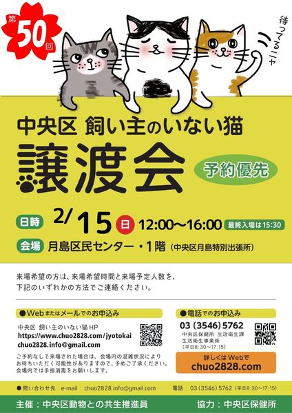 | イベント内容 | 【2/15(日)12:00-16:00】月島で行われる中央区飼い主のいない猫譲渡会に参加予定です。 ※譲渡会までに里親決定となったり、当日体調などにより不参加となる可能性がございます。 ーーー以下、主催団体の譲渡会案内になります。 中央区では様々な事情で飼い主のいないネコ達にずっとのおうちを見つけるために中央区動物との共生推進員が中心となって、譲渡会を定期開催しており今回で48回目を数えます。 区内の高齢者からの引き取りネコなど大人猫はもちろん、 子猫たちも参加します。 ※お届けやフォローの関係で中央区在住の方や隣接区在住の方を優先させていただきます。 ※猫の多くは春に生まれますので今の時期は生後半年過ぎた手術の終わった体調も安定した子猫や大人猫が中心です。 お留守番が長い方や初めて猫を飼う方でも飼いやすい子も参加します。 ネコとの暮らしをご希望されている方、ネコのお預り希望の方、またネコとの暮らしについて色々ご質問がおありになる方、皆様のご来場をお待ちしております。 ※里親を希望される方は、本人確認できる物をご持参の上、当日会場まで直接お越し下さい。 会場内の混雑を防ぐため、事前に来場希望時間と来場予定人数をご連絡ください。 <譲渡会> 開催日:2026年2月15日(日曜日) 開催時間:12:00〜16:00(最終入場時間15:30) 会場:中央区月島区民センター 1階会議室 譲渡会の事前お申し込みはこちらから → https://www.chuo2828.com/jyotokai 里親さま募集中の猫ちゃんはこちら → https://www.chuo2828.com/catslist 参加猫の情報は、譲渡会の1週間前くらいにWebに掲載する予定です。 今回も1匹でも多くの猫さんたちに、新しい家族とのご縁が繋がりますように。 |