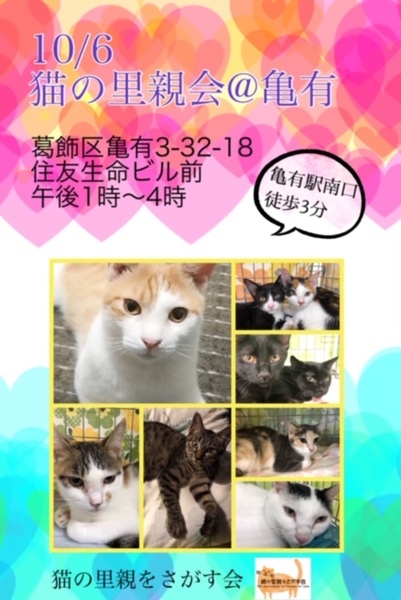 | イベント内容 | 10/6 日曜日 午後1時~4時 雨天の場合は会場が変わります 雨天時会場・葛飾区亀有3-21-12 カルチャースペースあい ご質問大歓迎です。 分からない事などなんでも聞いて下さい。 ご家族の皆様で生涯、家族の一員としてたっぷり愛情を注いでくださるご家庭をお待ちしております。 ご希望に添えない場合もございますのでご了承下さい。 【以下の方には譲渡しておりません】 ・猫の飼育が許可されていない住居にお住まいの方 ・未成年者、友人同士&同棲でお住まいの方、乳児のいるご家庭 ・単身者、高齢者のみのご家庭の方 ・脱走防止対策にご協力頂けない方 ・経済的に不安定な方(休職中、就職活動中、アルバイト等) ・仔猫の場合は留守番多いご家庭 ・住居の構造を聞かせていただく事があります。(階下への騒音など) 【当里親会は猫さんと里親様とのマッチングを大切にしています】 はじめて猫さんをお迎えする場合に適した猫さん、お留守番の長い里親さんに適した猫さん等、 お迎えする不安など経験豊富なスタッフがお話を聞き、アドバイスさせていただいています。 お気軽にお声をかけてください。 【ご負担頂く費用について】 譲渡の際に譲渡負担金(医療費の一部、譲渡金、お届け時の交通費)を里親様にご負担頂く事により 飼い主のいない猫の継続的治療や保護、新しいご家族の元へ送り出す事ができます。 ご理解とご協力をお願い致します。 ◆ご負担頂く医療費につきましては個々の猫(子猫、成猫、♂、♀)によって異なります◆ ★仔猫10.000~15.000 (ワクチン・ウイルスチェック・駆虫) ★成猫18.000~20.000 (ワクチンウイルスチェック・駆虫・不妊去勢手術済) ★猫をお届けする時の交通費をいただいております。 1500〜実費 【譲渡の条件がございます】 ①終生飼育 ②完全室内飼育 ③不妊・去勢手術 ④譲渡負担金 ⑤契約書の署名捺印 ⑥定期報告義務をご了承ください。 トライアル期間は全ての猫さんに設けております。 トライアル期間を経て初めて正式譲渡となります /////////////////////////////////////// 現在進行形で足立区より多頭飼育崩壊が発生しています。 里親様を緊急募集中。 https://twitter.com/shosukereiko 【猫の里親をさがす会】 https://blog.goo.ne.jp/bobton |