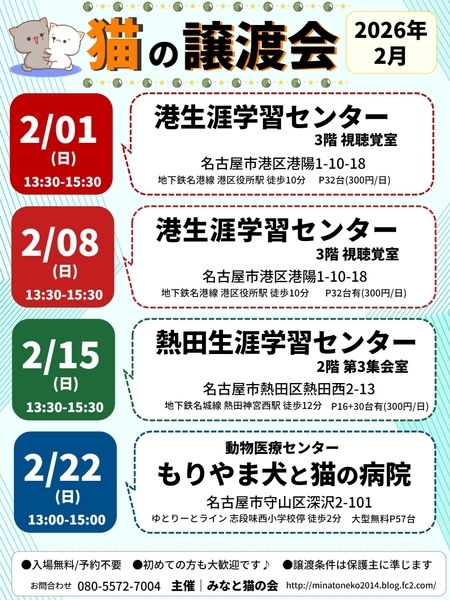 | イベント内容 | ◆私たちも、最初は手探りでした◆ 「迎える」と決めなくても、まずは雰囲気を感じに来るだけで大歓迎です わからないことがあるのは、当たり前のこと 私たちも日々学びながら活動しています 不安な気持ちをそのまま、会場のスタッフに預けてみませんか あなたのペースを一番に大切にいたします ●会場は ・駐車場16台+30台有(利用料300円) ・予約不要&入場無料 ●参加猫リスト http://minatoneko2014.blog.fc2.com/blog-entry-1895.html ●参加猫は ・子猫も成猫も全頭ワクチン接種済 ・ノミダニ駆除済 ・トイレ躾済 ・ケージレストのトレーニング済 ●参加する猫たちについて 基本治療やトイレのしつけは済んでいます 足りないのは共に生きる新しい家族だけです 「譲渡会は行ったことがなくて不安…」 「猫を飼うのははじめて」 「今すぐじゃないけどいずれ猫と暮らしたい」 そんな皆様も大歓迎! ●譲渡に関して ※完全室内飼い・誓約書・治療費負担等の 諸条件があります。 ※譲渡やトライアルに関する契約条件は 猫の保護主によって異なります。 ●譲渡会その他についての問い合わせは みなと猫の会 minatonekonokai@gmail.comもしくは 080-5572-7004 までお願いします。 ★参加猫ちょこっと紹介★ 写真2枚目 さく ♂ 5か月くらい 慎重でビビりさん 頭が良く、自立心高めです 譲渡の流れなど詳しくは下記ブログをご覧ください。 ◎主催者ブログ みなと猫の会 ~こぴっと猫だより~ http://minatoneko2014.blog.fc2.com/ |