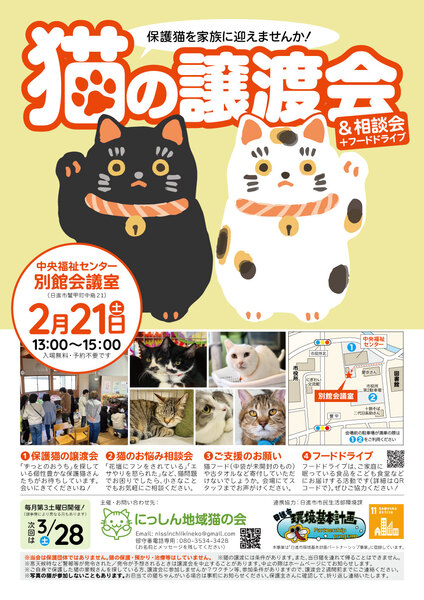 | イベント内容 | 2月21日(土)に「猫の譲渡会&相談会」を開催いたします。 保護猫を迎えたい方はもちろん、猫に関する相談会も同時開催しています。 ご近所との猫トラブルなどでお悩みの方も、どうぞお気軽にお立ち寄りください。 地域貢献の一環として、子ども食堂などに食材を提供するフードドライブの受付もしております。 ご家庭や職場で余っている食品がありましたらぜひお持ちください! 小さな譲渡会ですが、猫さんも人間も良いご縁を紡げられるよう、のんびり続けています。 遊びにきてくださいね(*^^*) 【日時】2月21日(土)13:00〜15:00 【会場】中央福祉センター「別館会議室」 【入場無料・予約不要】 【主催】にっしん地域猫の会 【ホームページ】https://nissinchiikineko.main.jp ※会場は中央福祉センター本館内ではなく、その隣の奥まったところにある小さな建物「別館会議室」にて開催しております。お手数ですが、HPにて地図をご確認ください(中央福祉センターへのお問い合わせはご遠慮ください)。 ※会場前に駐車場がございますが、数が少ないため、満車時は本館の駐車場をご利用ください。図書館のむかいにある市役所の臨時駐車場もご利用いただけます。 ※室内換気のため冷暖房が効きにくい場合がございます。 ※ペット同伴のご入場はできません。 ※猫ちゃんの譲渡には条件がございます。詳細はホームページをご参照ください。 |