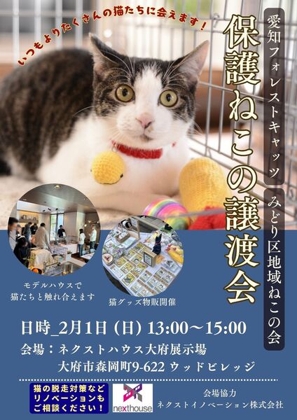 | イベント内容 | 日時 2月1日(日) 13:00〜15:00 場所 愛知県大府市森岡町9-622 ネクストハウス大府展示場 ※JAアグリタウンげんきの郷近くにある、ウッドビレッジの敷地内です 主催 愛知フォレストキャッツ みどり区地域ねこの会 今回は2団体の合同開催! いつもより、たくさんの猫たちが参加します 見学、相談だけでも大丈夫! 予約不要、参加費無料なのでお気軽に 猫に関する活動を何かしたい、という方も歓迎です 買うだけで保護猫支援になる、チャリティーねこマルシェも同時開催です。 素敵なオリジナル猫グッズを手に入れるチャンス!? 遊びに来る感覚で、お越しくださいませ |