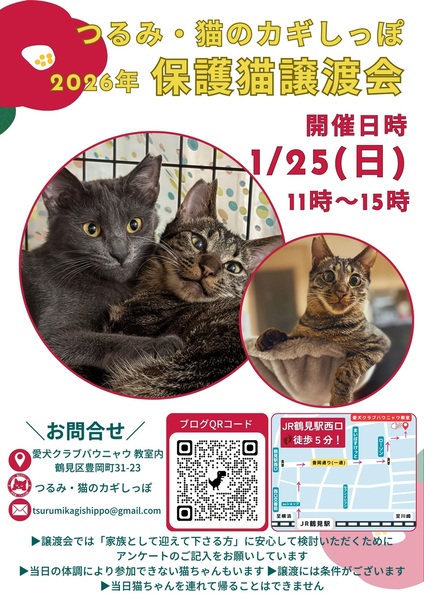 | イベント内容 | 1月25日(日)つるみ・猫のカギしっぽ 定例譲渡会を開催いたします 横浜市鶴見区豊岡町31-23 愛犬クラブバウニャウ 教室内 午前11時~午後3時 お問い合わせ先: tsurumikagishippo@gmail.com 予約は不用です 感染予防のため: ①室内ではマスクを着用していただきます ②入場時にアンケートをご記入いただきます (連絡先等を含む) お問合せは会のメールアドレスにお願いいたします。 tsurumikagishippo@gmail.com 会の譲渡条件をあらかじめ御覧くださいませ (ブログ右上に「ご確認ください」とあります) |