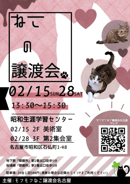 | イベント内容 | モフモフねこ譲渡会名古屋 猫たちの幸せなお家探しのために譲渡会を開催しております。 個人ボランティアの集まりです。 自分たちの出来ることから頑張っております! 一匹でも幸せになれる猫が増えますように 場所 昭和生涯学習センター 住所 名古屋市昭和区石仏町1-48 時間 13時30分~15時30分 交通機関等 地下鉄「御器所」鶴舞線2番出口南約300m 桜通線3番出口南東約300m 駐車場24台(満車の場合は近隣コインPをご利用ください) 参加猫の情報は下記モフモフねこ譲渡会名古屋ブログにてご確認ください。 https://mofumofuneko4.fc2.net/ 【譲渡会について】 ・譲渡会は入場無料、予約不要です。お気軽にご参加ください。 ・会場へのお問い合わせはご遠慮ください。 ご質問は下記メールアドレスへお願いいたします。 mofumofuneko4☆gmail.com ☆を@に変更してお問い合わせください。 ・猫の引き取りはしておりません。 ・譲渡会当日に猫をお渡しすることはありません。 ・保護主によって譲渡条件が違う場合があります。 ・参加予定でも譲渡会前にトライアルになる場合があります。 ご希望の猫がいましたらまずはお問い合わせをお願いいたします。 【参加猫について】 ・ノミ駆除、駆虫、トイレ躾、ワクチン3種接種済。 ・年齢や健康状態に応じて、避妊手術を行っております。 ・参加予定で紹介していても当日体調不良等で欠席になる場合があります。 【譲渡の約束事】 ・ペット飼育可の住宅にお住まいの方。 ・完全室内飼育。 ・脱走防止の対策をしていただける方。 ・避妊手術未実施の場合、避妊手術 の実施と報告をしていただける方。 ・ご家族全員が猫を飼うことに同意していること。 ・譲渡後、しばらく定期連絡を入れていただける方。 *お一人暮らしの方、60歳以上の方は、身内の方の保証が必要となる場合がございます。 #名古屋昭和区 #昭和生涯学習センター #譲渡会 #保護猫 #地域猫 #さくらねこ #tnr #里親募集 #里親募集中 #猫 #ねこ #殺処分ゼロ #買わずに飼おう #モフモフねこ譲渡会名古屋 #ペットショップに行く前に #譲渡会のお知らせ #猫と暮らしたい |