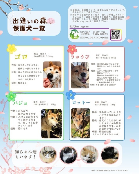 | イベント内容 | 出逢いの森の犬・猫たちの譲渡会を開催します! 個性豊かな子たちにぜひ会いに来て下さい! 14:30 受付開始 14:45 説明会 15:00 ふれあい・見学 16:00 終了 予約は不要です。 当日に犬猫を連れて帰ることは出来ません。 ※以前説明会にご参加していただいた方は、説明会参加不要です。15:00までにお越しください。 ※当日の体調等により、写真の保護犬猫がいない場合もございます。予めご了承ください。 譲渡会に参加の際、任意のご寄付を500円からお願いしております。 参加犬猫や譲渡条件、会場へのアクセスなどの詳細は、「出逢いの森ホームページ」やInstagramをご覧ください。 https://deaimori.com/foster-parents/ |