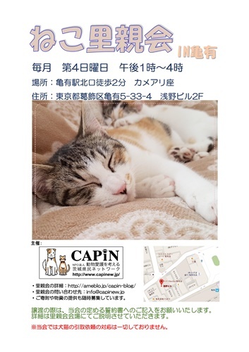 | イベント内容 | 3月24日(日)ねこちゃんの里親会in亀有を開催します♪ たくさんの可愛いねこちゃんたちが参加しますので、ぜひご参加下さい! ★広い室内での開催です。 じっくり探したい方、保護主とお話しをしながら猫と触れ合いながらゆっくり愛猫を見つけてください! 会員一同お待ちしております。 日時:3月24日(日)13時~16時 場所:東京都葛飾区亀有5-33-4 浅野ビル2F カメアリ座 http://kameari-za.space/ 亀有駅北口より徒歩2分です。 ※すべての猫がワクチン接種、駆虫・ノミ駆除を済ませています。 主催:NPO法人動物愛護を考える茨城県民ネットワークCAPIN(キャピン) ・ホームページ http://www.capinew.jp/ ・ブログ http://ameblo.jp/capin-blog/ https://twitter.com/ibaraki_capin https://www.facebook.com/npocapin 参加予定のねこ達のほかにも、多くのねこ達の里親様を募集しています。 http://ameblo.jp/capin-blog/entry-11691762225.html 【猫の引き取り依頼の対応は一切しておりません】 |