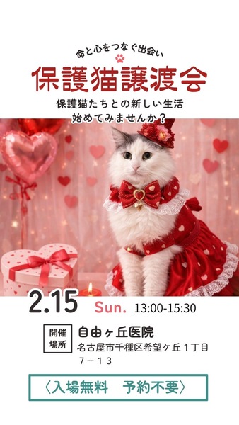 | イベント内容 | 2月15日(日) 13:00〜15:30 愛知県名古屋市千種区希望ヶ丘1-7-13 自由ケ丘医院 主催 愛知フォレストキャッツ 地域猫活動やTNR活動の過程などで 保護した猫たち たくさんの猫たちが参加します 見学、相談だけでも大丈夫! 予約不要、参加費無料なのでお気軽に 猫に関する活動を何かしたい、という方も歓迎です 遊びに来る感覚で、お越しください |