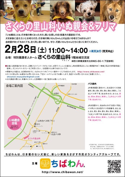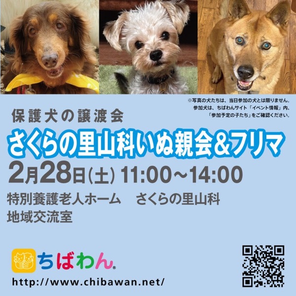 | イベント内容 | 特別養護老人ホームさくらの里山科にて 「さくらの里山科いぬ親会&フリーマーケット」を開催いたします。 こちらの施設は、「伴侶動物福祉」をホームの理念とし、 ちばわんや東日本大震災の被災地から犬や猫をむかえてくださり、 ちばわん「いぬ親会・ねこ親会(譲渡会)」は2013年6月より開催させていただいております。 2026年2月28日(土)11:00 ~14:00 (雨天決行) 荒天により中止する場合には、当日の8時までにこのページにてお知らせします。 【アクセス】 ※JR横須賀駅からの場合 京浜急行バス 須3、須4、須5系統に乗車『北武』バス停下車徒歩約10分 須53に乗車『山科台』バス停下車徒歩約7分 ※JR衣笠駅からの場合 駅から徒歩6分の『衣笠十字路』にて京浜急行バス 須3、須4、須5系統に乗車『北武』バス停下車徒歩約10分 または須53に乗車『山科台』バス停下車徒歩約7分 会場駐車場は限りがありますので公共交通機関をご利用ください。 【いぬ親会のながれ】 ①いぬ親募集中のわんちゃんとお会いになりたい方はどなたでも自由にご参加いただくことができます。当日は、ちばわんボランティアは首から名札をさげていますので、どうぞご遠慮なくお声をかけて下さい。また、いぬ親募集中のわんちゃんのそばには預かりボランティアが控えておりますのでわんちゃんについてのご質問も受け付けております。 ②気に入ったわんちゃんがいましたら、お申し込みアンケートにご記入の上、ボランティアにお渡し下さい。(前日までにアンケートを送信してお申し込みいただくこともできます。) 【いぬ親】お申込みアンケート ③アンケート内容を拝見し、お話させていただきます。 ④原則として3日以内にお返事の連絡をさせていただきます。 ⑤ご縁が成立した場合には、後日、こちらからご自宅までわんちゃんをお届けし、約1ヶ月のお試し生活に入っていただきます。 お届けの際に、書面での譲渡契約書を交わします。 ◆譲渡までの流れについてはこちらをご覧ください →いぬ親さんになるまで https://chibawan.net/flowofadoptive/ ◆譲渡負担金についてはこちらをご覧ください →ちばわんホームページ譲渡負担金について https://chibawan.net/flowofadoptive/allocation/ フリーマーケット等のすべての売上は、 ちばわん保護犬・保護猫たちの為に 大切に使わせていただきます。 お問い合わせ いぬ親会問い合わせhttps://chibawan.net/inquiry_shounan/(←ここをクリック) ※件名に【さくらの里山科 いぬ親会 問い合わせ】とご記入の上お送りください。 なお参加犬につきましては「参加予定の子たち」をご覧ください。 お問合わせの受付は、開催日前日までとさせていただきます。 |